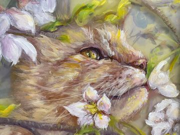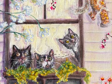 Cute, maximalist genre paintings with cats, flowers and other garden creatures and other styles/media.